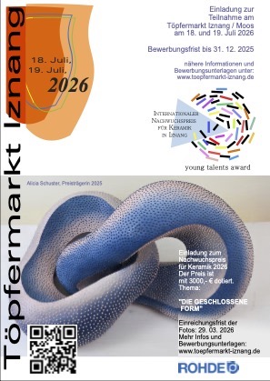 2026 wird zum 5. Mal von den Veranstaltern des Töpfermarktes Iznang der Internationale Nachwuchspreis der JUNGEN TALENTE, young talents, ausgelobt werden, verbunden mit der Wertschätzung für all diejenigen, die als hauptberufliche Keramiker/innen den Schritt in die Selbstständigkeit wagen.