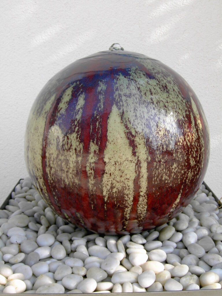 Seine Produktpalette reicht von auf der Töpferscheibe gedrehte Waschbecken und Geschirrkeramik bis hin zu Feuerschalen aus Keramik in verschiedenen Größen, Wasserobjekte in Form von Kugelbrunnen und Wassersäulen, sowie Skulpturen.