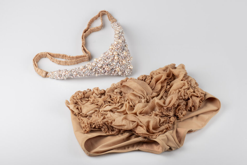 Hüftgürtel „Progress?“, 2024, Perlen, Seide, Elastikband, Garn, Readymade BH-Schieber, genäht,