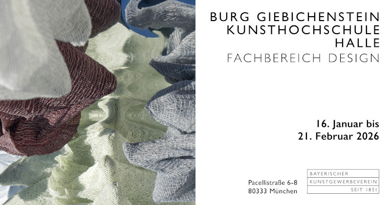 Vom 16. Januar bis 21. Februar 2026 zeigt die Burg Giebichenstein Kunsthochschule Halle ausgewählte Arbeiten von Studierenden und AbsolventInnen des Fachbereichs Design in der Galerie des Bayerischen Kunstgewerbevereins in der Münchner Innenstadt.